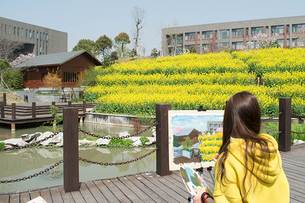 为觅春踪垄上行,晴光一点入眸明。梯田式的素有“小婺源”之称的油菜花田绝对是取景的又一佳境。这里,蜂飞蝶舞流连其间,金波拂涌而飘溢醉人,廊下清池活渠、红鲤浮萍,坡上视野开阔,清影翠竹……除取景拍照外,此处经常还引来不少艺术爱好者取景写生。