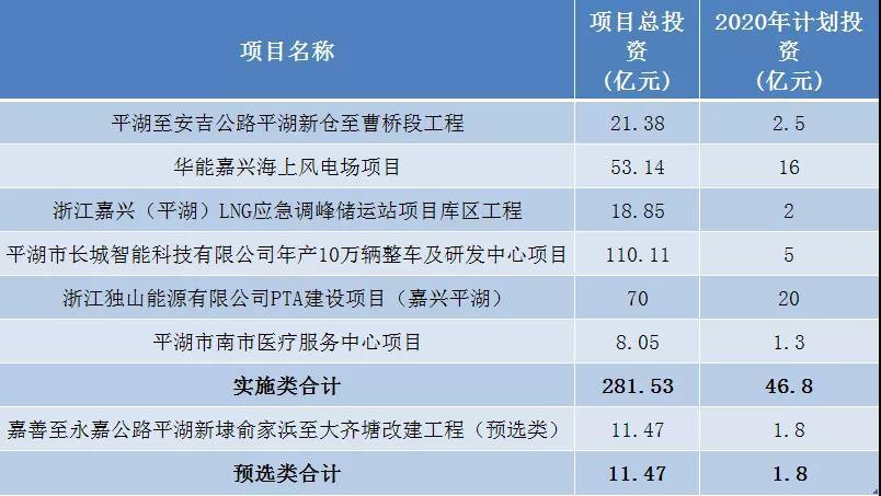 哪些项目入选了?据了解,平湖市有6个项目列入2020年省重点建设项目,总投资281.53亿元,当年计划投资46.8亿元。项目涵盖交通项目、能源项目、工业项目和社会发展项目。同时,1个项目列入预安排项目。