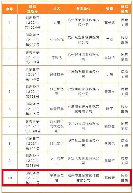 近日,国家电影局发布关于2021年1月全国电影剧本(梗概)备案、立项公示的通知,浙江省共有10部电影作品的剧本(梗概)通过备案。我市影视公司兰舍文化申报的电影《平湖派琵琶》是其中之一。
