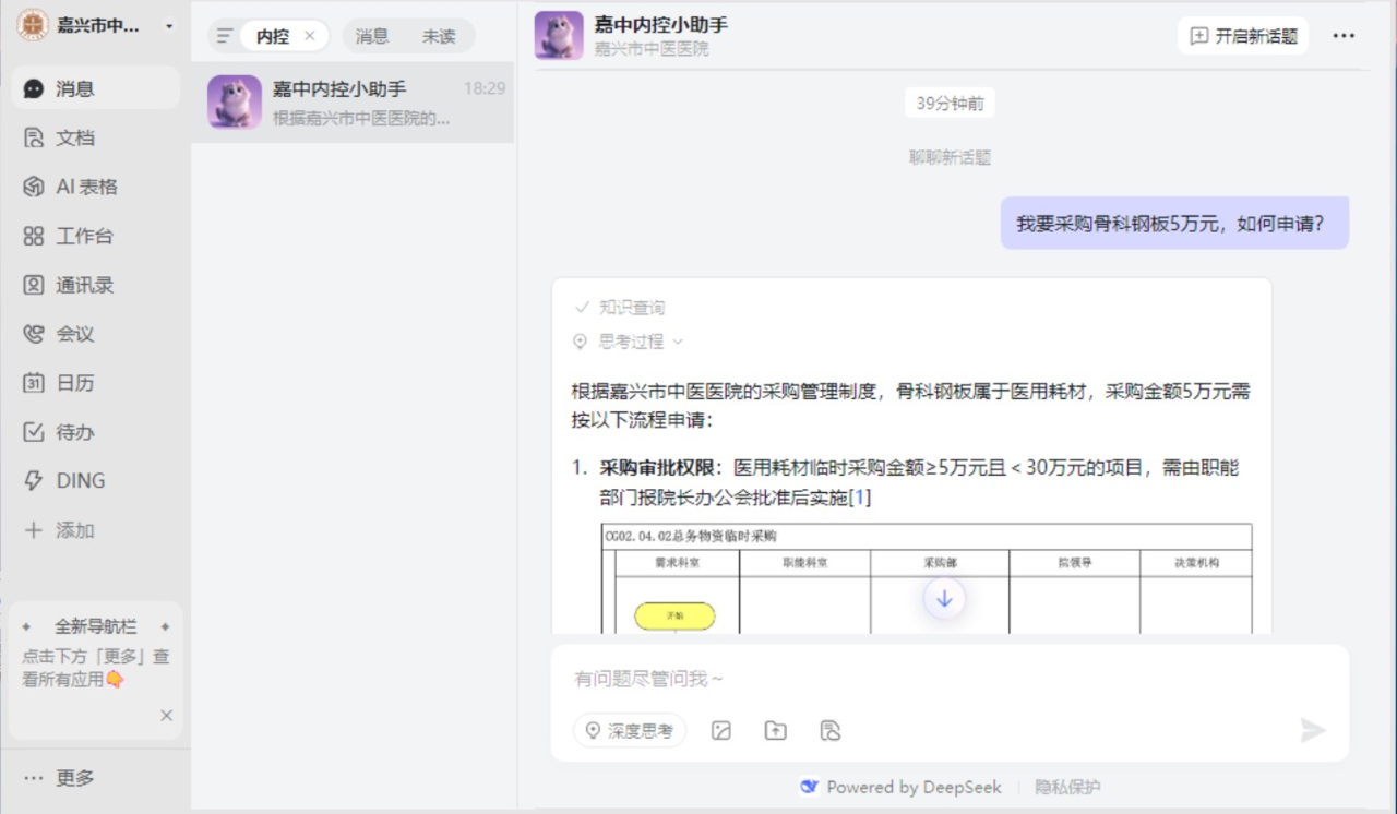 医院以问题导向对医疗质量与安全、“三重一大”等重点领域的制度实行动态管理,形成171项业务流程、168个业务流程图、239项权限指引明细,新增、修订院级制度569项。创新建立嘉中内控AI小助手,实现单位层面和业务层面内部控制体系标准化。将中医药“辨证施治”理念融入制度建设,针对药品采购、耗材管理等关键环节,建立“双人复核+风险预警”机制。运用中医“辨证论治”思维,“纪审财法”联动,强化部门协同和审计结果运用,建立“一把手”交办督办机制,2025年已形成交办督办清单341项,完成315项,扎实做好“后半篇文章”。