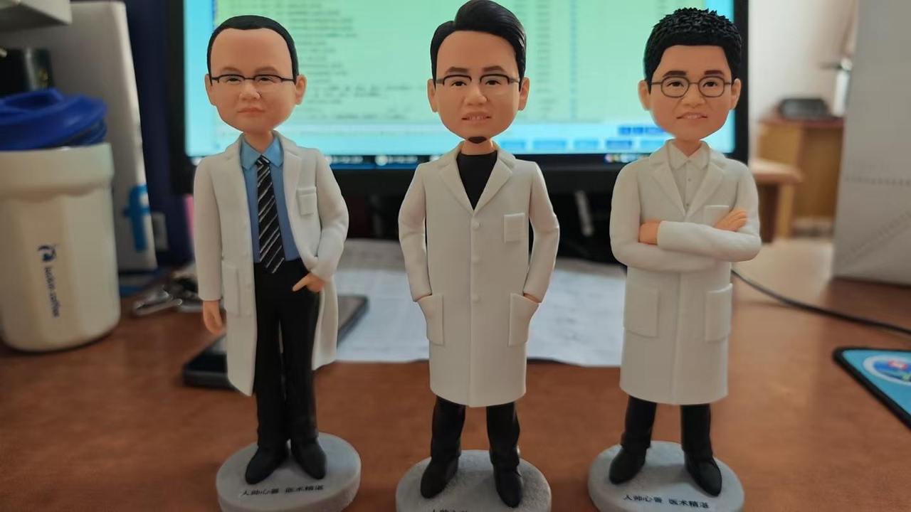 嘉兴市第二医院神经外科的医生办公室里,多了三张熟悉的“面孔”——它们不是照片,而是三位身着白大褂的3DQ版医生像。这是患者于奶奶(化名)的家属特意定制送来的礼物,眉眼间还原了沈健、郁龚杰、冯石峰医生平日里的神态,也承载了一段医患携手跨越危难、最终重获新生的温情。