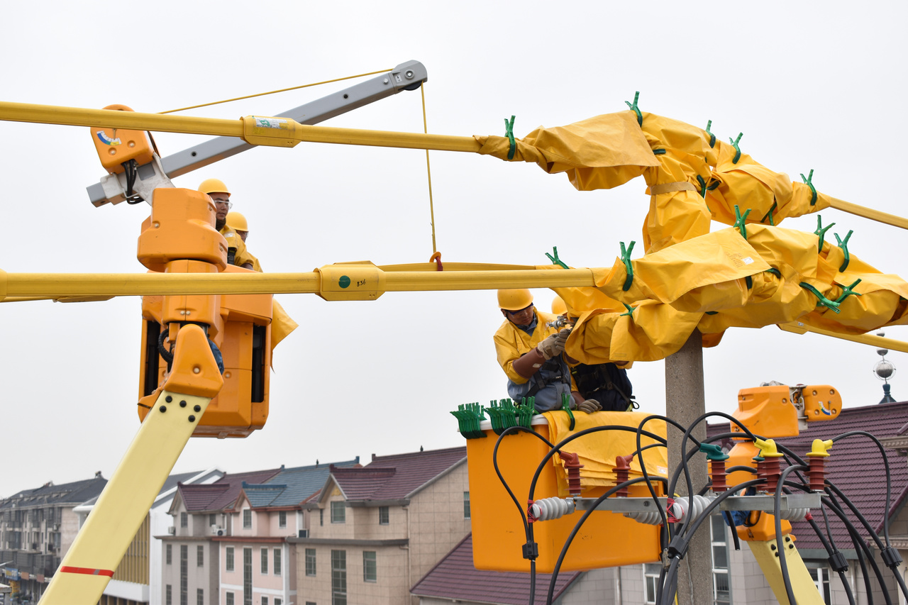 作业现场,在支好绝缘斗臂车支腿、设置现场安全围栏与标识牌后,现场工作负责人召开班前会,交代作业内容、危险点等情况,随后作业人员便穿上绝缘披肩、绝缘手套及其他装备,全副武装进入操作斗,熟练地操作两辆斗臂车升至近十五米高空,依次完成设置绝缘遮蔽、耐张瓷瓶安装、导线耐张线夹收紧、开关两侧引线搭接等一系列操作步骤。